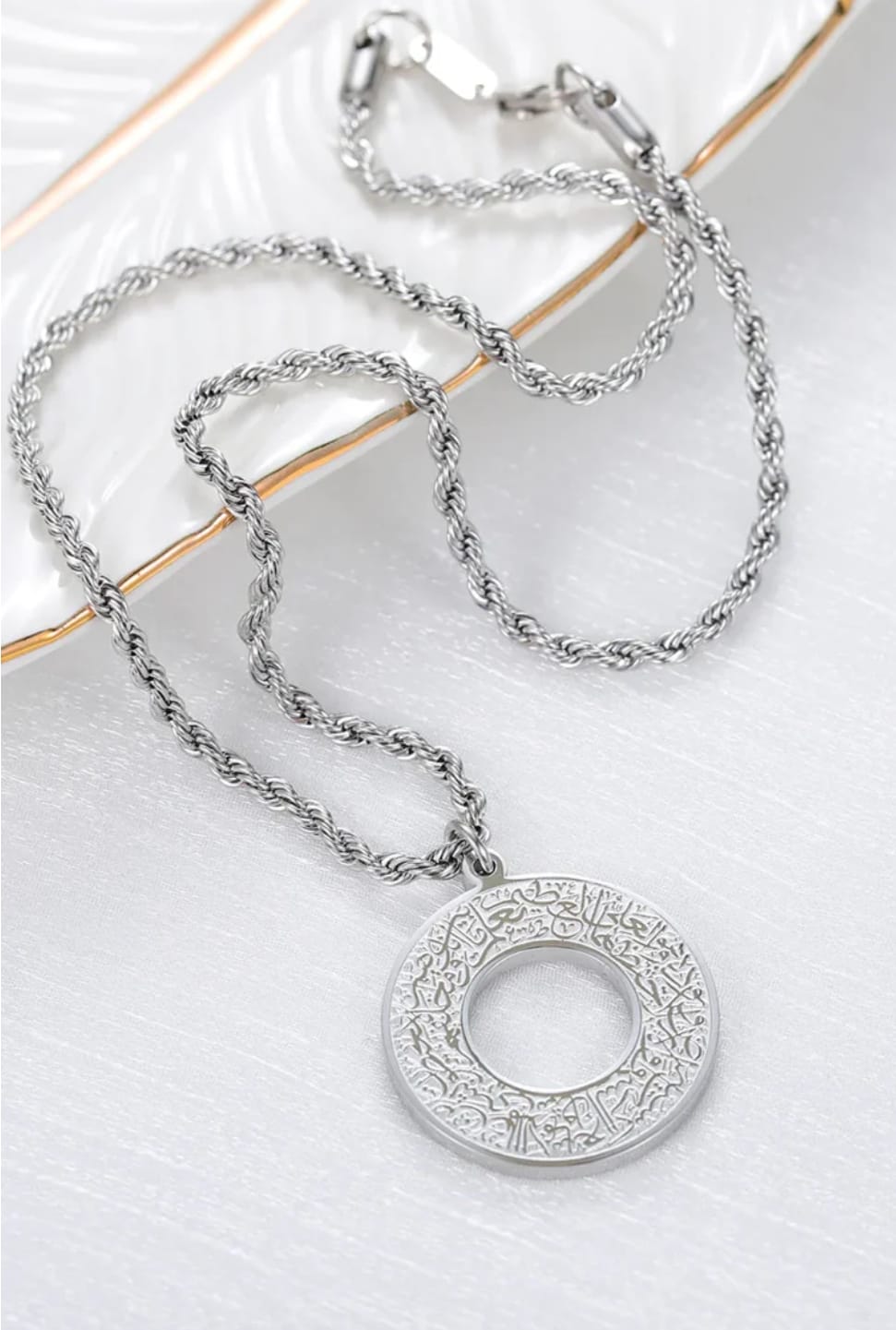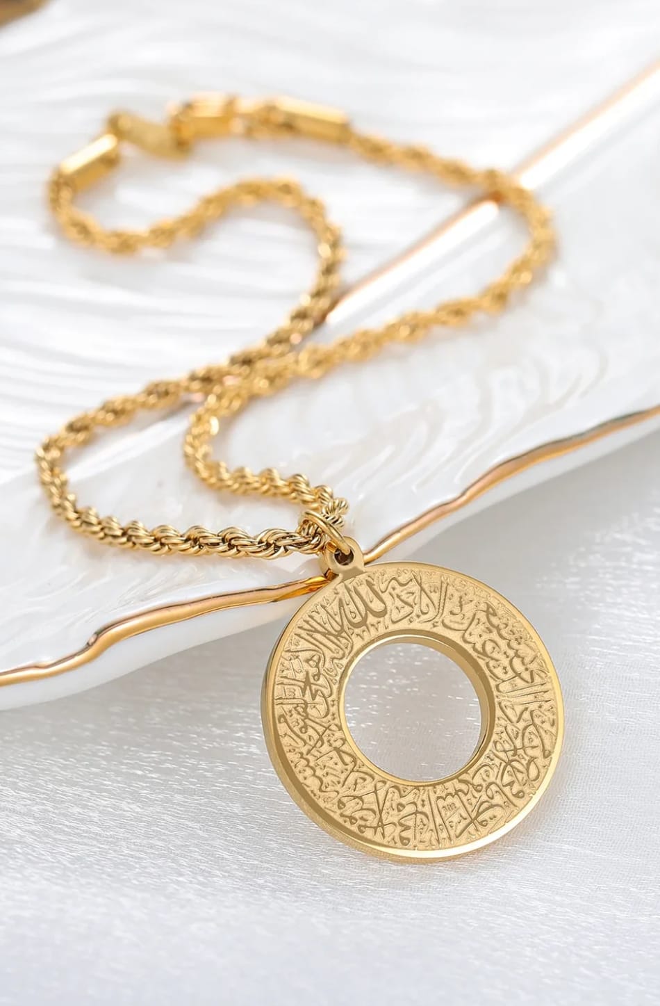 Wear the profound verses of Ayatul Kursi close to your heart, elegantly inscribed on the golden canvas of this hollow disk. The pendant's delicate design captures the essence of divine protection, making it a timeless piece for daily devotion or special occasions.